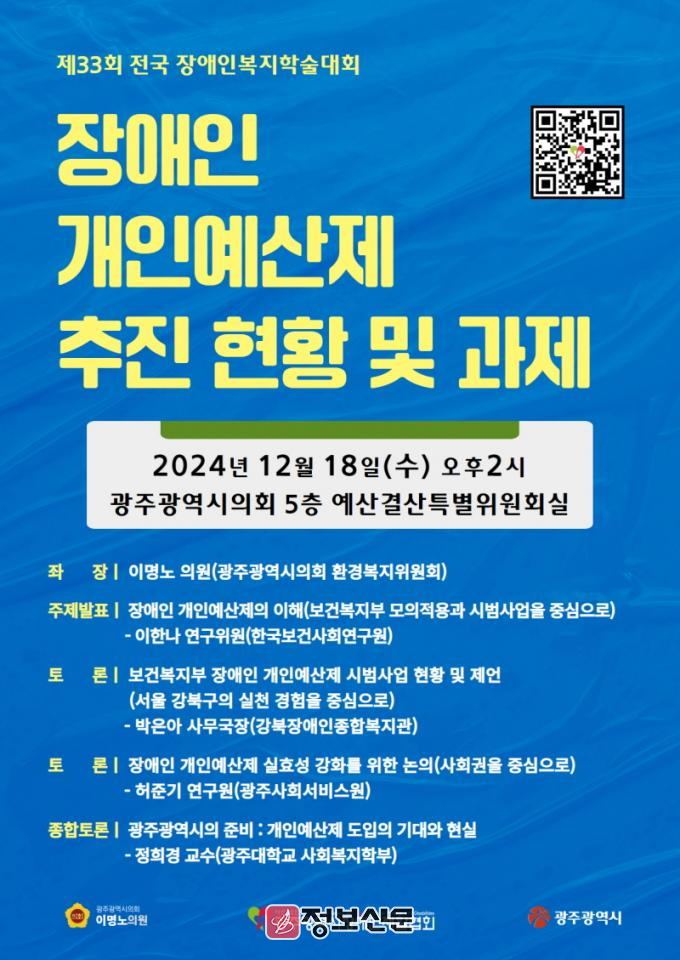 이번 학술대회는 광주광역시의회 환경복지위원회 이명노 의원과 공동주관으로 영국, 스웨덴 등 선진국에서 먼저 도입된 개인예산제는 현재 정부의 국정과제인 “장애인 맞춤형 통합지원을 향한 차별 없는 사회 실현”과 제6차 장애인 정책 종합계획에 포함되어, 2024~2025년에는 지자체 시범사업이 시작되고 2026년도에는 본격 시행됨에 따라 정책에 대한 현황 및 과제를 들여다보고 현장과 전문가들의 의견을 청취하는 자리로 마련하였다.
