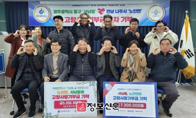 ![]() 자매결연도시인 나주시 노안면과 광주 동구 서남동이 지난 3일 고향사랑교차기부식을 가졌다. (사진제공-나주시) |
