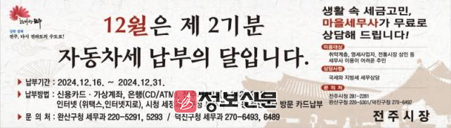 한편, 이강준 전주시 기획조정실장은 “생활 속 친밀한 매체 홍보를 통해 납부시기에 대한 인식을 향상시키고 세입 증대로 이어질 수 있도록 하겠다”며 “앞으로도 다양한 홍보 활동을 통해 납세자 중심의 세무행정 서비스를 추진하겠다”고 말했다.