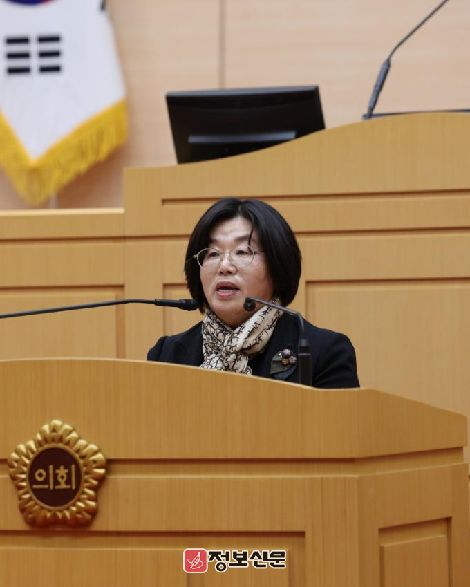 ![]() 전라남도의회 제386회 제2차 정례회 제3차 본회의(5일)에서 오미화 의원이 5분 자유발언을 하고 있다. |