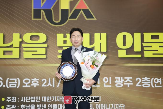▲ 지난 12월 6일 광주 홀리데이 인 광주호텔 2층 연회장에서 열린 ‘2024년 제6회 호남을 빛낸 인물 대상’에서 (사진_우측) 문상이 정보(IT)교육강사가 공로부문 ‘지역사회공로’대상을 수상하고 기념촬영을 하고 있다. |