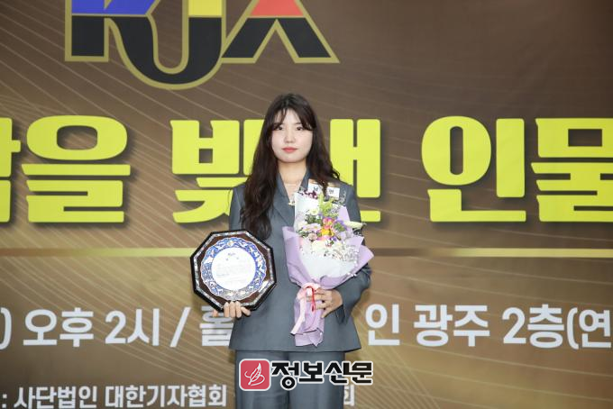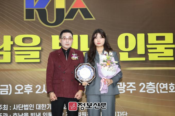 ![]() ▲ 지난 12월 6일 광주 홀리데이 인 광주호텔 2층 연회장에서 열린 ‘2024년 제6회 호남을 빛낸 인물 대상’에서 (사진_우측) 남수현 순천시청 양궁선수가 체육부문 ‘체육’대상을 수상하고 기념촬영을 하고 있다. |