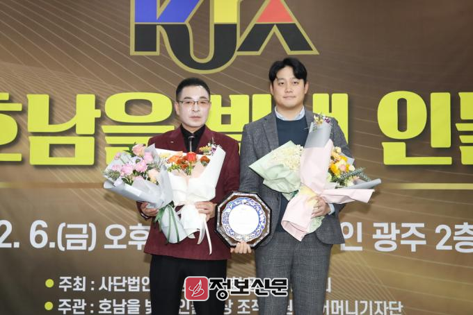 ![]() ▲ 지난 12월 6일 광주 홀리데이 인 광주호텔 2층 연회장에서 열린 ‘2024년 제6회 호남을 빛낸 인물 대상’에서 (사진_우측) 전지연 민주평화통일자문회의 광주서구협의회 회장을 대신해 이병주씨가 공로부문 ‘사회공헌공로’대상을 수상하고 기념촬영을 하고 있다. |