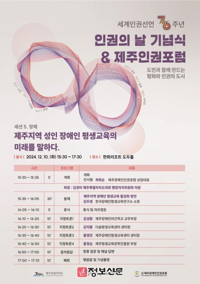 한편, 이번 토론회는 제주특별자치도가 주최하는 세계인권선언 76주년 인권의 날 기념식 및 제주인권포럼의 제5세션으로 진행된다. 기념식은 같은 날 오전 10시 30분에 열린다.