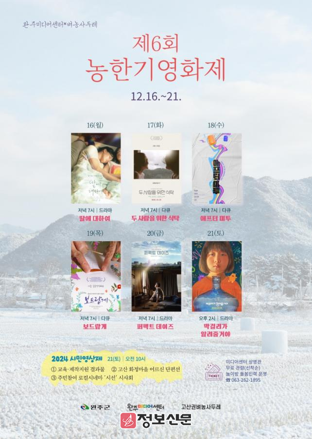 안충환 완주미디어센터장은 “농한기영화제는 주민들이 직접 만든 영화부터 국내외에서 인정받는 다양한 장르와 주제의 영화를 만날 수 있는 기회다”며 “미디어를 매개로 지역사회의 소통과 화합을 증진하고 문화적 역량이 성장하는 계기가 되도록 하겠다”고 말했다.