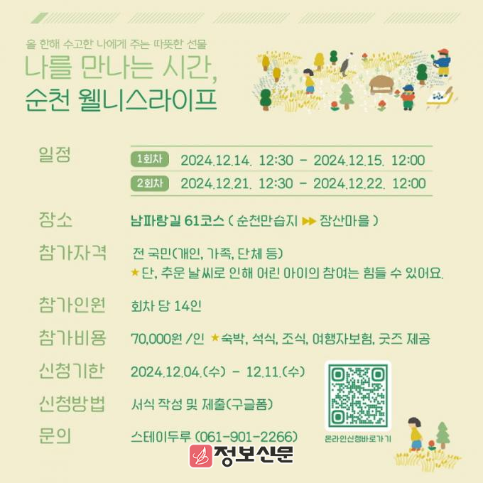 시 관계자는 “자연과 인간이 어떻게 함께 살아갈 수 있는지, 진정한 쉼이 어떤 것인지, 오감으로 느낄 수 있는 시간을 제공하기 위해 프로그램을 준비했다”며 “연말에 순천에서 올 한 해를 마무리하며 또 다른 길을 나아갈 수 있는 힘을 얻어가시길 바란다”고 밝혔다.