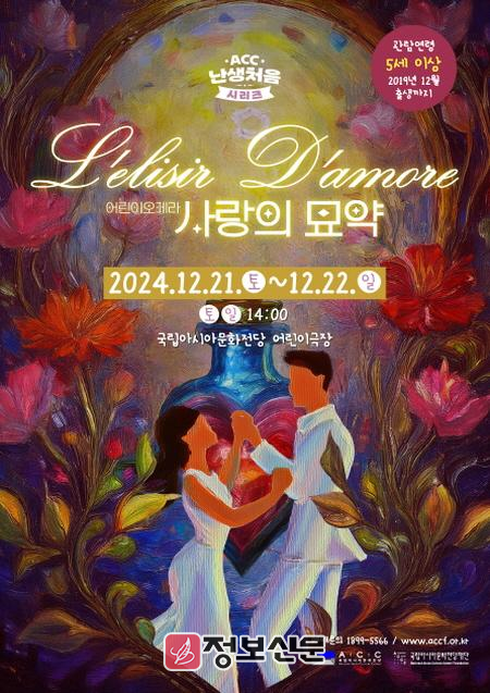 어린이를 위한 오페라 ‘사랑의 묘약’은 12월 21일과 22일 오후 2시에 공연하며, 5세 이상이면 관람 가능하다. 관람권은 1만 5천원이며, ACC재단 누리집(www.accf.or.kr)에서 예매할 수 있다.