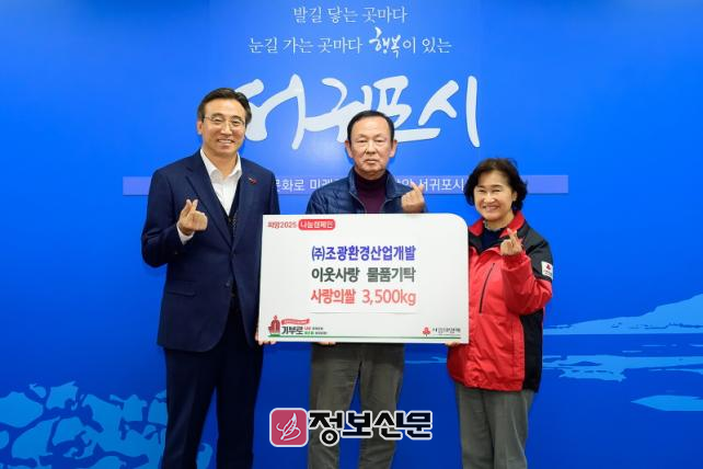 ㈜조광환경산업개발(대표 조만기)에서 서귀포시청「연말연시 사랑나눔 지원 창구」를 통해 기탁된 이웃돕기 물품 쌀 10kg 350포는 서귀포시 관내 취약계층 및 사회복지시설에 전달될 예정이다.
