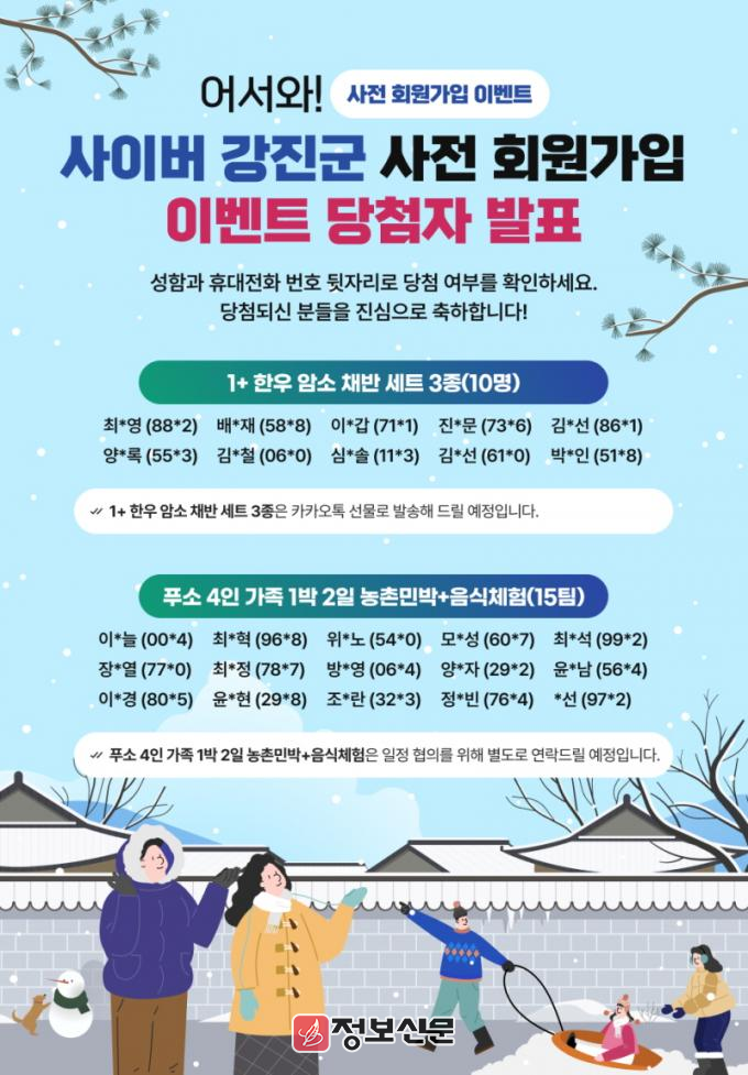 ![]() 강진군, 사이버 강진군민 2차 사전가입 이벤트 성황리에 종료 |
