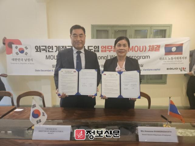이번 라오스와 MOU 체결은 2023년에 이어 2번째로 라오스 루앙프라방주 남박군과 외국인 계절근로자 도입을 위해 진행되었으며, 라오스 노동사회복지부 고용부의 아누손 캄싱사왓 국장, 남원시 농정과장, 남원시조합공동사업법인 백남정 대표 등 관계자가 참석했다.