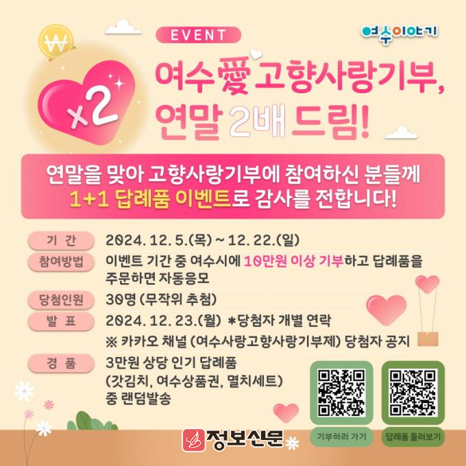 ![]() 여수시(시장 정기명)가 연말을 맞이해 오는 22일까지 고향사랑기부 참여자에게 추가 답례품을 제공하는 ‘여수愛 고향사랑기부, 연말 두 배 드림!’ 이벤트를 진행한다. |
