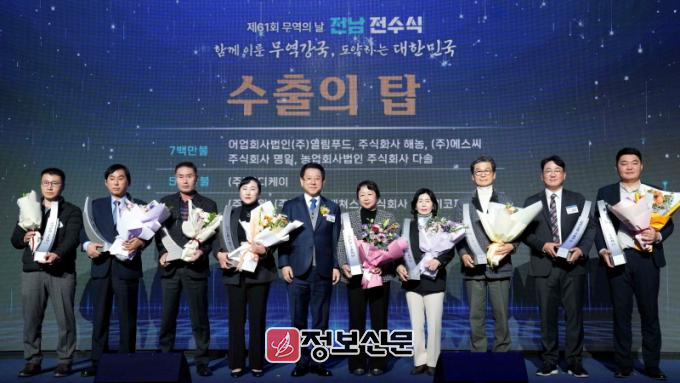 수출탑을 수상한 기업은 총 31개 사다. ▲7천만불탑은 (주)이이더불유 케이에이치피시, (주)대창식품이 수상했다. ▲5천만불탑은 광양알루미늄주식회사 ▲2천만불탑은 한성푸드영농조합법인, (주)가리미 ▲1천만불탑은 (주)엠.이.시, ㈜스위코진광, 선일물산(주), 어업회사법인(주)순수해작 ▲7백만불탑은 어업회사법인㈜열림푸드, ㈜해농, ㈜에스씨, ㈜명일, 농업회사법인(주)다솔 ▲5백만불탑은 (주)디디케이 ▲3백만불탑은 ㈜성원, ㈜엘케이벤쳐스, ㈜투케이코퍼레이션, (유)성문, 맛나푸드 주식회사 ▲2백만불탑은 어업회사법인(주)해초, 바이오코프㈜, ㈜영신케미칼, ㈜해미로, 팬코스(주), 농업회사법인(유)은빛, 대륙식품(주) ▲1백만불탑은 (주)세일식품 농업회사법인, ㈜지본코스메틱, ㈜디엠티, 완도맘영어조합법인이 각각 수상했다.