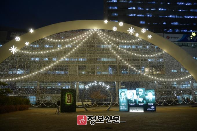 광주시는 행정동 앞 높이 12m, 길이 49m 크기의 아치형 구조물인 ‘빛고을무지개’에 발광다이오드(LED)로 조명을 설치하고, 전면부에는 광주 출신 한강 작가 노벨상 수상을 기념하는 포토존을 조성했다.