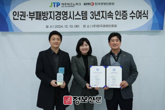 제주테크노파크(원장 문용석, 제주TP)는 한국경영인증원으로부터 인권경영시스템과 부패방지경영시스템에 대한 지표 심사와 현장실사를 거쳐 인증을 획득했다고 11일 밝혔다. 2022년 첫 인증 이후 3년 연속이다.