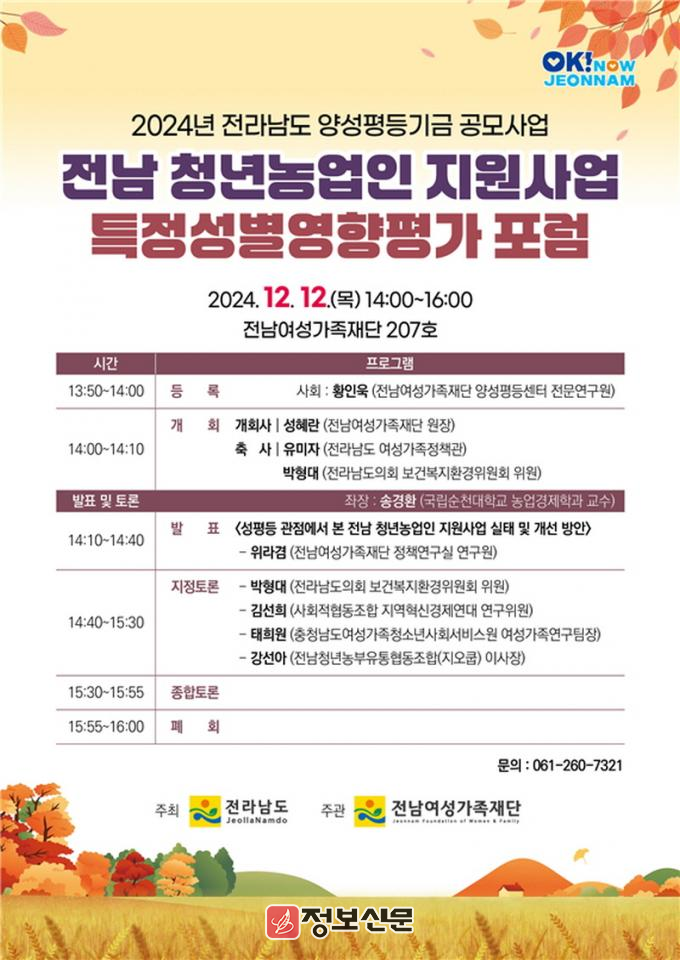 ![]() 전남여성가족재단, 「전남 청년농업인 지원사업 특정성별영향평가 포럼」 개최 |