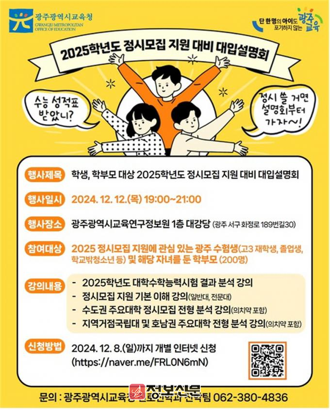 ![]() 광주시교육청, 대입 정시모집 지원 전략 설명회 개최 |