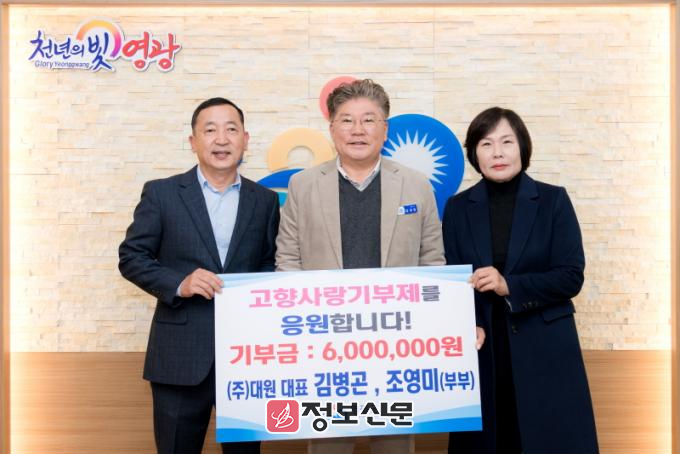 ![]() (주)대원 김병곤.조영미 대표부부, 고향사랑기부금 기탁 |