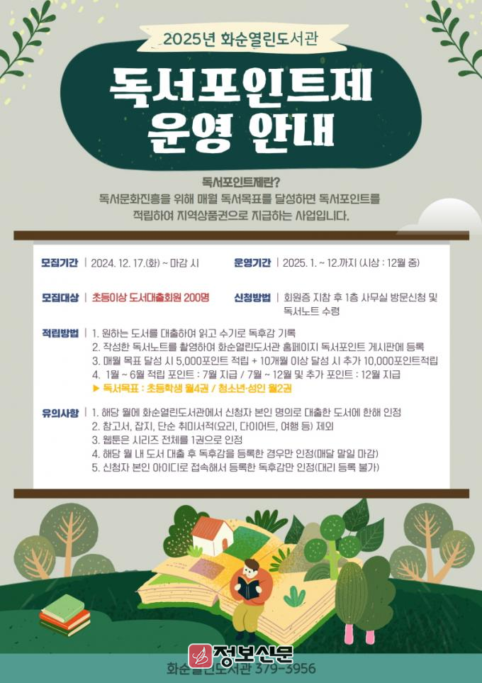 ![]() 화순열린도서관, 2025년 독서점수제(독서포인트제) 참가자 모집 |