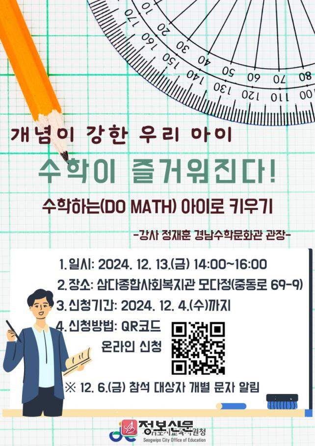 정 관장은 수학의 가치, 수학의 의미와 수학을 공부한다는 것의 의미를 강연하고 가정에서 실천할 수 있는 수학 학습의 구체적인 방법에 대해 소개할 예정이다.