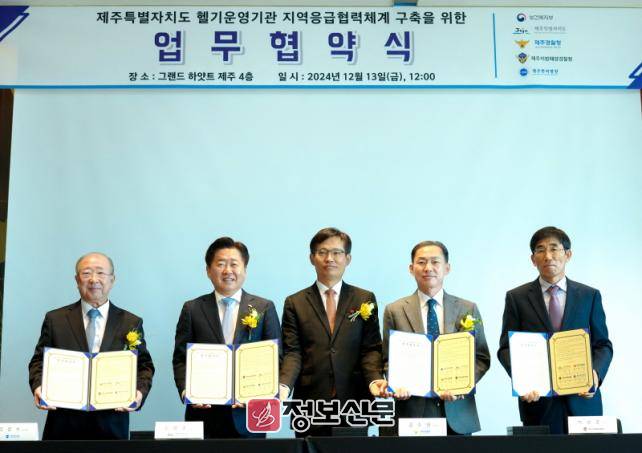 제주도는 13일 그랜드하얏트제주(드림타워)에서 제주도경찰청,제주지방해양경찰청, 한라의료재단과 ‘헬기 운영기관 지역응급협력체계 구축을 위한 업무협약’을 체결했다.