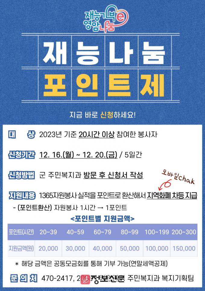 재능 나눔 포인트제에 대한 자세한 안내는 영암군 주민복지과( 470-2418, 2071)에서 안내한다.