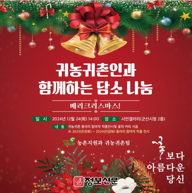 먼저 24일부터 군산시청 2층 시민갤러리에서는 주민과 귀농귀촌인이 만든 유화와 압화 작품이 전시되며, 오후 두시에는 꽃차와 커피를 시음 할 수 있는 귀농·귀촌인과 함께하는 담소나눔 행사가 열린다.