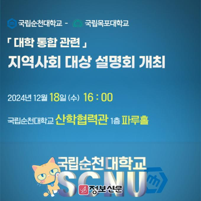 ![]() 순천대학교-목포대, 대학통합 추진 상황 지역사회대상 설명회 개최 |