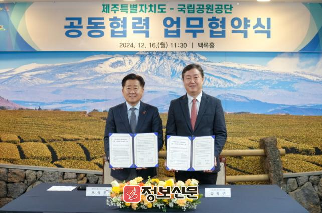 제주도와 국립공원공단은 16일 오전 도청 백록홀에서 ‘국립공원 관리 협력강화를 위한 업무협약’을 체결했다.