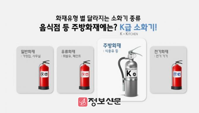 또한 기름을 많이 사용하는 음식점에서는 K급(주방용) 소화기를 꼭 비치해 두어야 한다. 주방 화재 발생 시 당황하며 물로 소화하게 되면 더 큰 화재로 번질 위험이 있으나, K급 소화기는 기름 표면에 유막을 형성해 냉각효과와 질식효과를 갖추어 주방화재의 적응성에 우수하다.