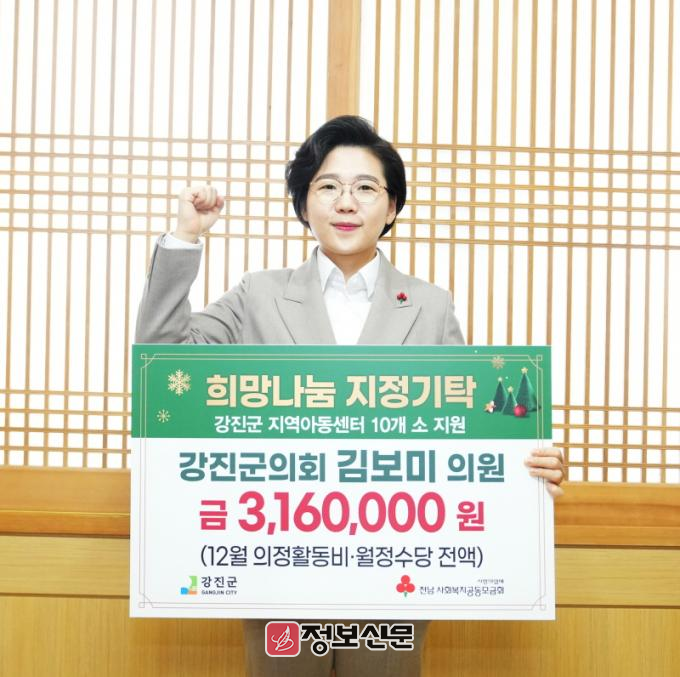 ![]() 김보미 강진군의원, 7년째 의정활동비 전액 기탁으로 지역사회 온정 전해 |