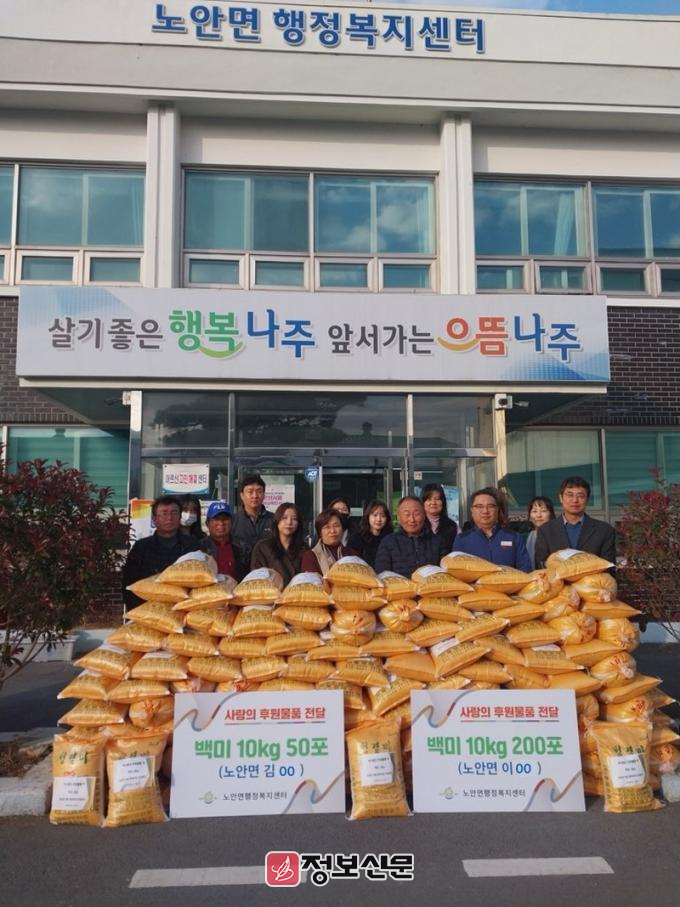 ![]() 나주시 노안면에 익명의 기부자 2인이 사랑의 백미 250포를 기탁했다. (사진제공-나주시)