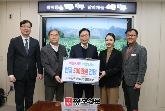 ![]() 나주전력설비사업협동조합이 나주시 취약계층을 위한 성금 500만원을 기탁했다. (사진제공-나주시)