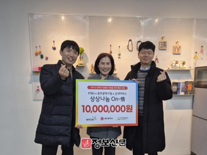 KT&G는 연말 나눔 문화 확산을 위해 소외계층을 지원하는 사회공헌 프로그램인 ‘KT&G 상상나눔 On-情’을 매년 진행하고 있다. 올해에도 ‘KT&G 상상나눔 On-情’은 지속적으로 증가하고 있는 지역사회 장애인들의 어려움을 해소하기 위해 맞춤형 서비스를 지원함으로써 광주광역시 복지체감을 향상시키기 위해 마련되었다. 해당 후원금은 광주 내 긴급하게 지원이 필요한 장애인을 지원하고, 노후 장애인 시설에 물품을 지원하는데 사용될 예정이다.