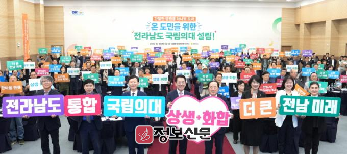 ![]() 전라남도는 2024년 각 분야에서 추진한 시책을 평가해 전남을 빛낸 올해의 시책 TOP10을 선정했다. 지난 10월 10일 장흥 통합의학컨벤션센터에서 열린 국립의대 설립방식 설명회에서 김영록 전라남도지사 등 참석자들이 국립의대 설립 염원 퍼포먼스를 하는 모습