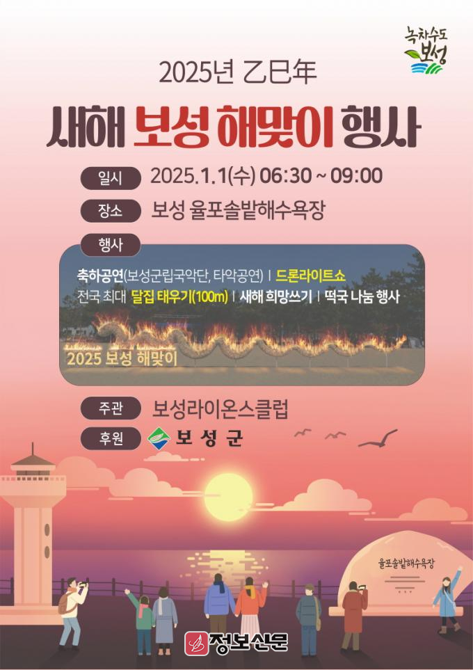 보성군 관계자는 “볼거리 가득한 행사인 ‘2025년 보성 새해 해맞이 행사’에 함께해 ‘꿈과 행복이 넘치는 희망찬 보성’에서 행복한 새해를 맞이하시길 바란다.”라고 전했다.