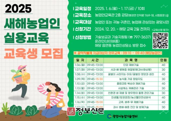 ![]() 광양시, ‘2025년 새해농업인 실용교육’ 교육생 모집 |