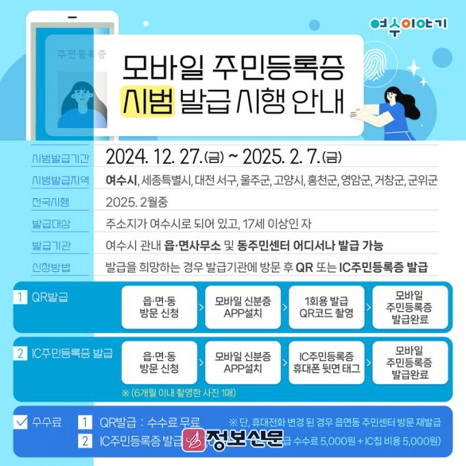 ![]() 여수시(시장 정기명)가 ‘모바일 주민등록증 서비스’ 시범 운영기관으로 선정돼 오는 27일부터 내년 2월 7일까지 모바일 주민등록증 발급을 시작한다. |