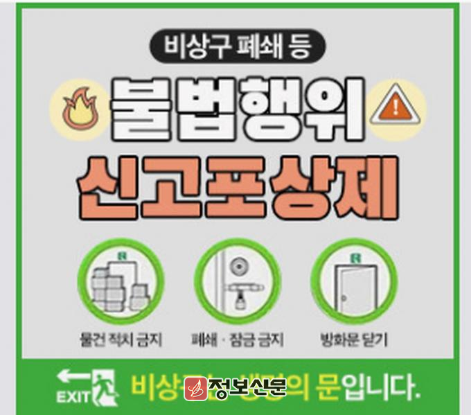 소방시설 불법행위 신고포상제는 비상구 등 소방시설에 가해지는 불법행위를 신고하는 경우 포상금을 지급하는 제도다. 소방시설에 대한 시민의 경각심 고취와 안전의식 확산을 통해 화재를 예방하고 피해를 최소화하고자 추진된 제도다.