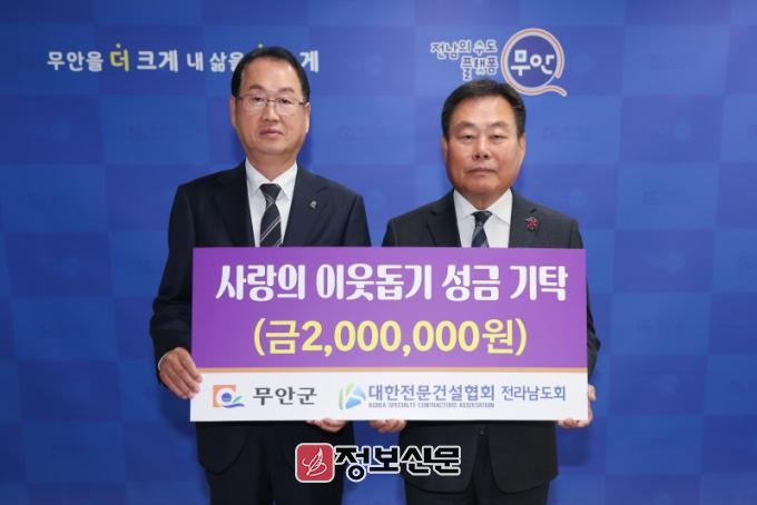 대한전문건설협회 전라남도회는 건설업의 육성 발전을 위해 설립된 협회로 전남에서 4천여명의 전문건설업자를 회원으로 두고 있으며, 매년 어려운 이웃을 위한 나눔 행보를 펼쳐오고 있다. 무안군에는 2022년에도 300만원을 기탁했었다.