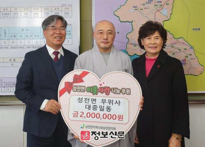 김걸 성전면장은 “이웃을 위해 자비나눔을 실천해 주신 법오 스님께 진심으로 감사의 말씀을 전한다”며 “뜻깊게 마련된 성금은 도움이 필요한 이웃에게 잘 쓰일 수 있도록 하겠다”라고 말했다.