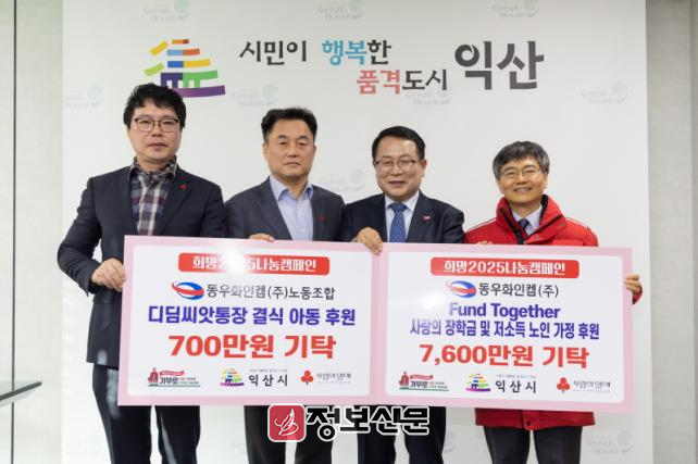 정헌율 익산시장은 "매년 청소년과 노인·아동 가정에 온정의 손길을 전해 주셔서 감사하다"며 "소외계층을 위한 동우화인켐㈜의 따뜻한 나눔은 단순한 금전적 지원을 넘어 지역사회에 선한 영향력으로 작용하고 있다"고 전했다.