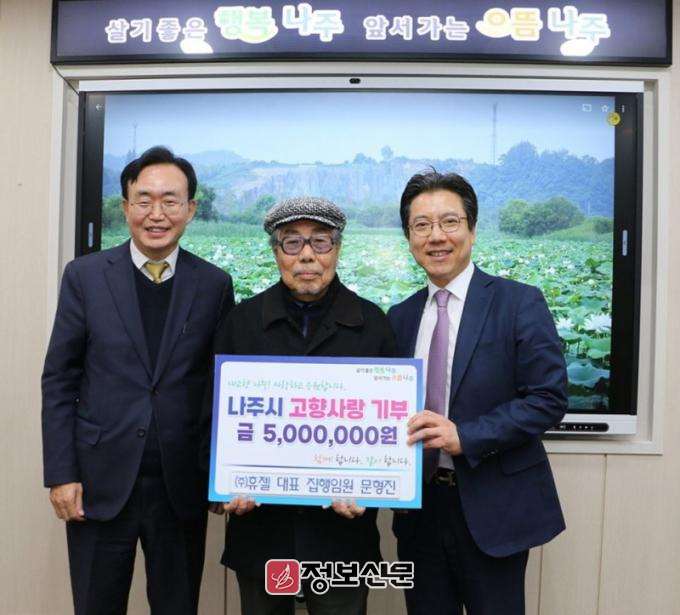 ![]() 문형진 ㈜휴젤 대표이사가 최근 고향사랑기부제 지정기금 사업인 ‘타오르는 강 문학관 조성 지원사업’에 500만원을 기탁했다. (사진제공-나주시)