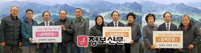 (재)임실군애향장학회(이사장 심 민)에 따르면 지난 26일 전주개인택시 임실향우회(회장 전철성, 3백만원), 임실읍 생활개선회(회장 이난희, 1백만원), 오수면 신기리 김명희·이봉임 부부(1백만원)가 군수실을 방문해 지역 미래인재 양성을 위해 사용해 달라며 애향장학금을 기탁했다고 밝혔다.
