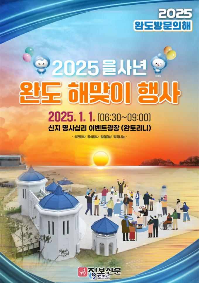 행사는 오전 6시 30분, 열두군고 풍물 길놀이를 시작으로 팝페라, 국악 등이 어우러진 새해 희망 콘서트가 진행된다. 이어 5명의 군민이 대북을 5번씩 치는 ‘희망 신년 타고’와 함께 완도군의 신년 화두를 대형 붓으로 적는 붓글씨 퍼포먼스도 이뤄진다.