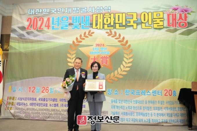 전명숙 의원은 지난 26일 한국프레스센터에서 열린 ‘2024년을 빛낸 대한민국 인물 대상’에서 투명하고 효율적인 행정구현과 군민 삶의 질 향상에 앞장선 공로를 인정받았다.
