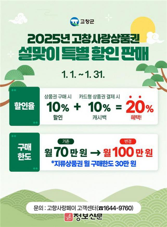 또한 지출 수요가 많은 설 명절을 앞두고 구매한도를 기존 70만원에서 100만원까지 상향하여 군민들의 부담을 덜고 지역 상권에 활력을 불어넣는다. 다만, 지류형 상품권은 1인당 30만원으로 구매한도를 줄여 건전한 유통질서를 만들어나갈 계획이다.