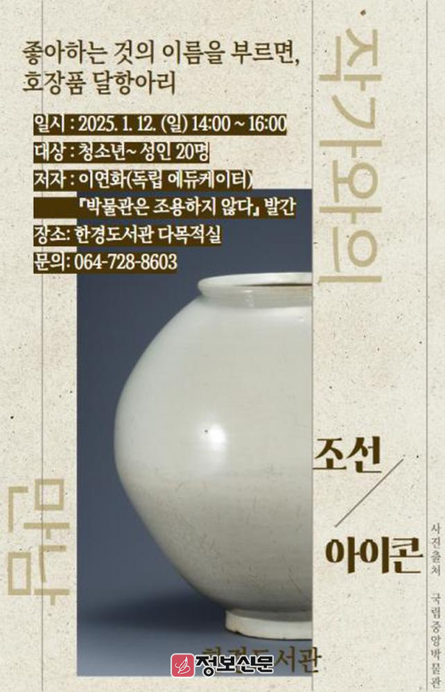 이연화 작가와의 만남은 오는 1월 12일(일) 오후 2시부터 한경도서관 다목적실에서 진행되며, 전날인 11일(토) 오후 2시부터는 서귀포시 중앙도서관 시청각실에서 「박물관 전시 감상법」을 주제로 강연이 열린다.