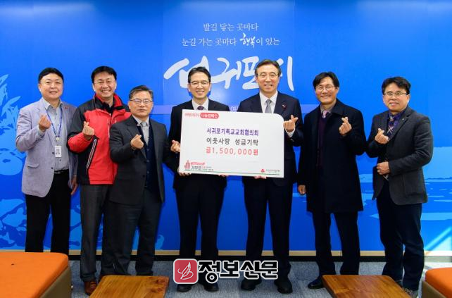 서귀포시 기독교교회협의회(회장 이정우)에서 서귀포시청「연말연시 사랑나눔 지원 창구」를 통해 기탁된 성금 150만원은 성탄트리 점등식 행사에서 모금한 성금으로 서귀포시 관내 취약계층 및 사회복지시설에 전달될 예정이다. 또한, 매해 성탄트리 점등식 행사를 통해 모금된 성금은 매년 지속적으로 기부하고 있다.