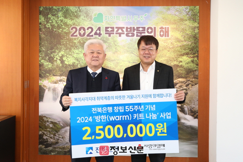 김성수 ㈜전북은행 무주지점장은 “전북지역 대표 은행이라는 자부심으로 무주발전과 군민 삶의 질 향상에 일조하기 위한 노력에 항상 앞장서고 있다”라며 “물품이 지역 내 어려운 이웃들에게 잘 전달이 돼서 따뜻한 겨울나기에 도움이 됐으면 좋겠고 이를 계기로 지역에도 기부문화가 확산됐으면 하는 바람”이라고 전했다.