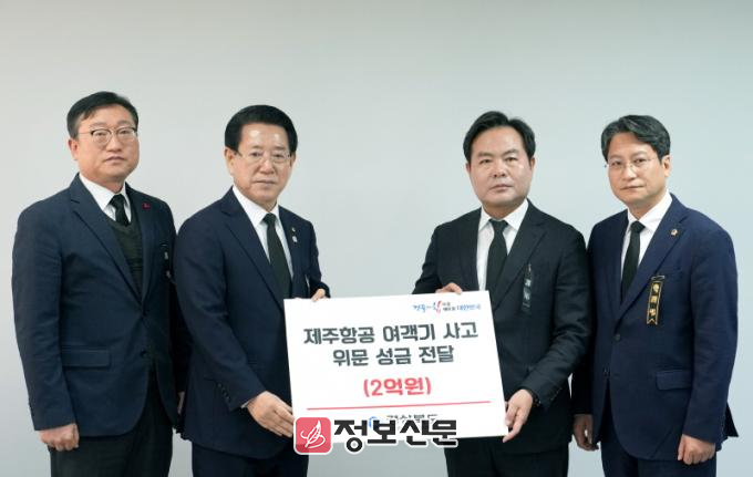 이날 김학홍 경북도 행정부지사는 무안스포츠파크 실내체육관에 마련된 제주항공 여객기 사고 희생자 합동분향소를 찾아 조문하고 위문 성금을 전달했다. 성금은 추후 여객기 사고 수습 및 피해자·유가족 지원을 위해 활용될 예정이다.